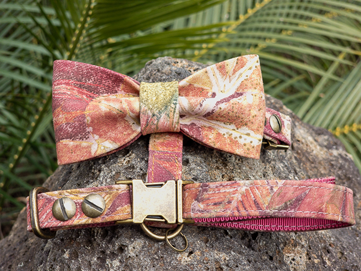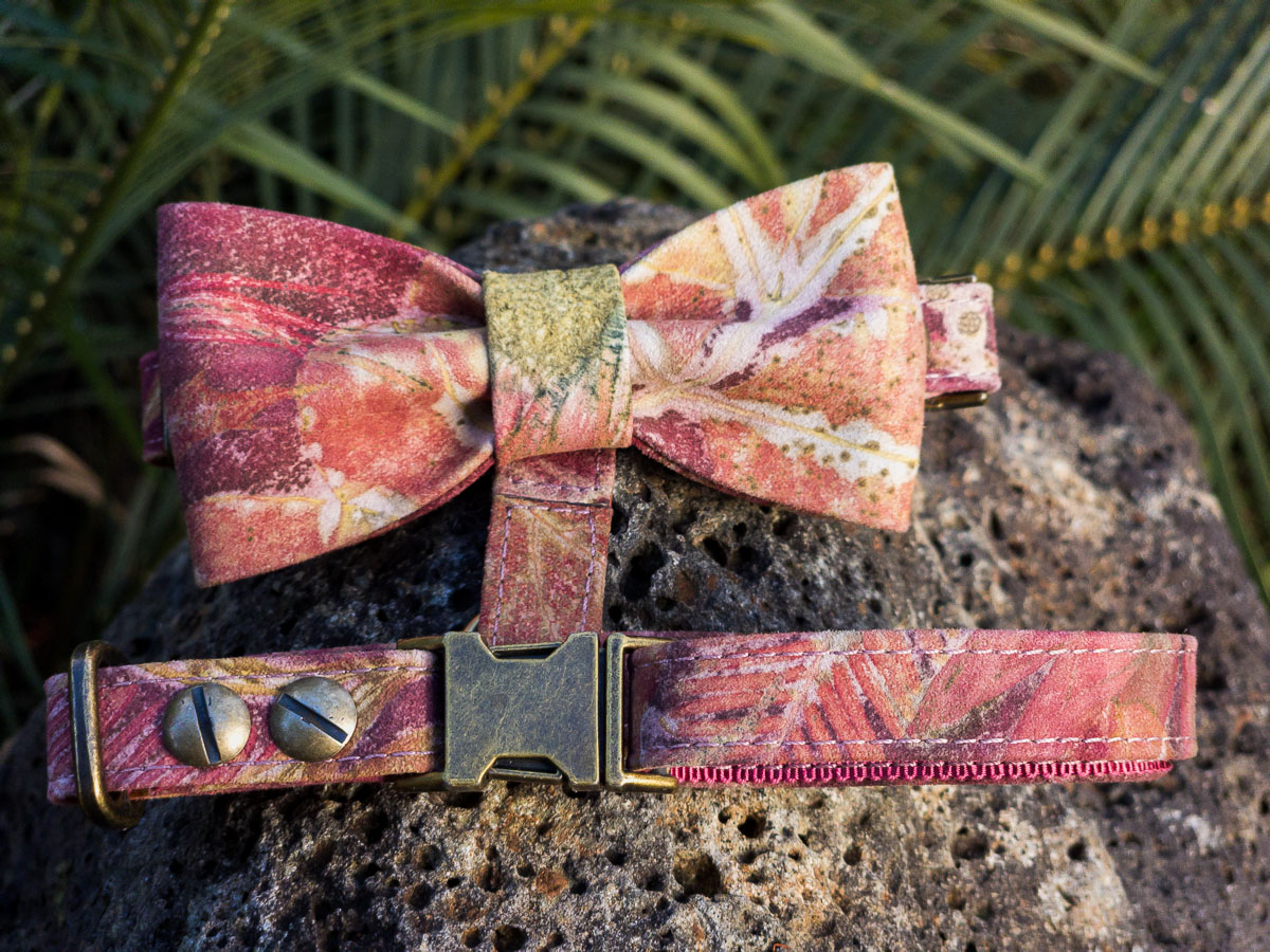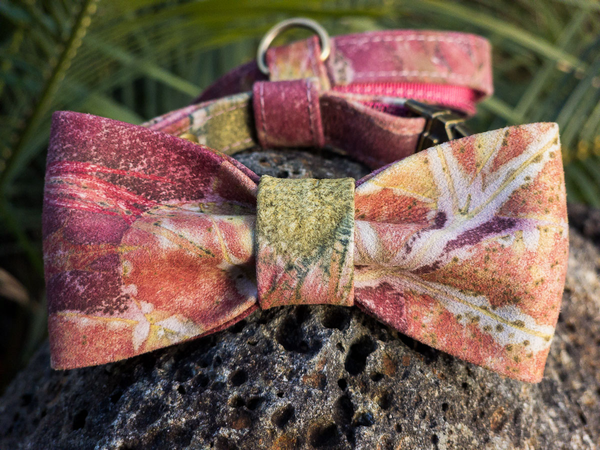 Each House Copernicus Bow Tie Harness is hand-crafted and stitched in small batches from sustainably sourced, eco-printed Australian kangaroo leather. Pressed and dried leaves and flowers are arranged on the hide, then bundled and steamed so their natural pigments and tannins transfer to the leather—creating permanent, plant-made prints (not painted on). The sculptural bow adds refined style without compromising fit or freedom of movement. No two harnesses are the same; this harness turns heads—expect attention!