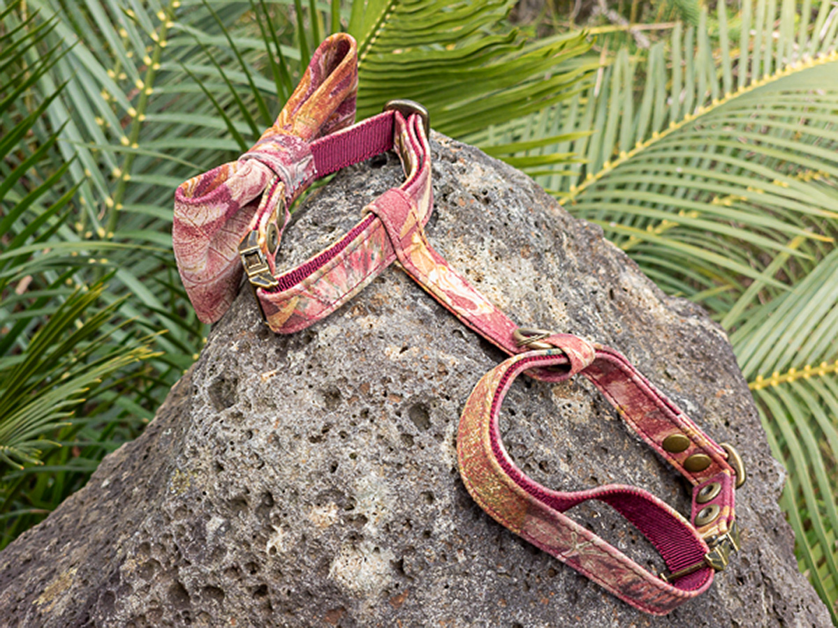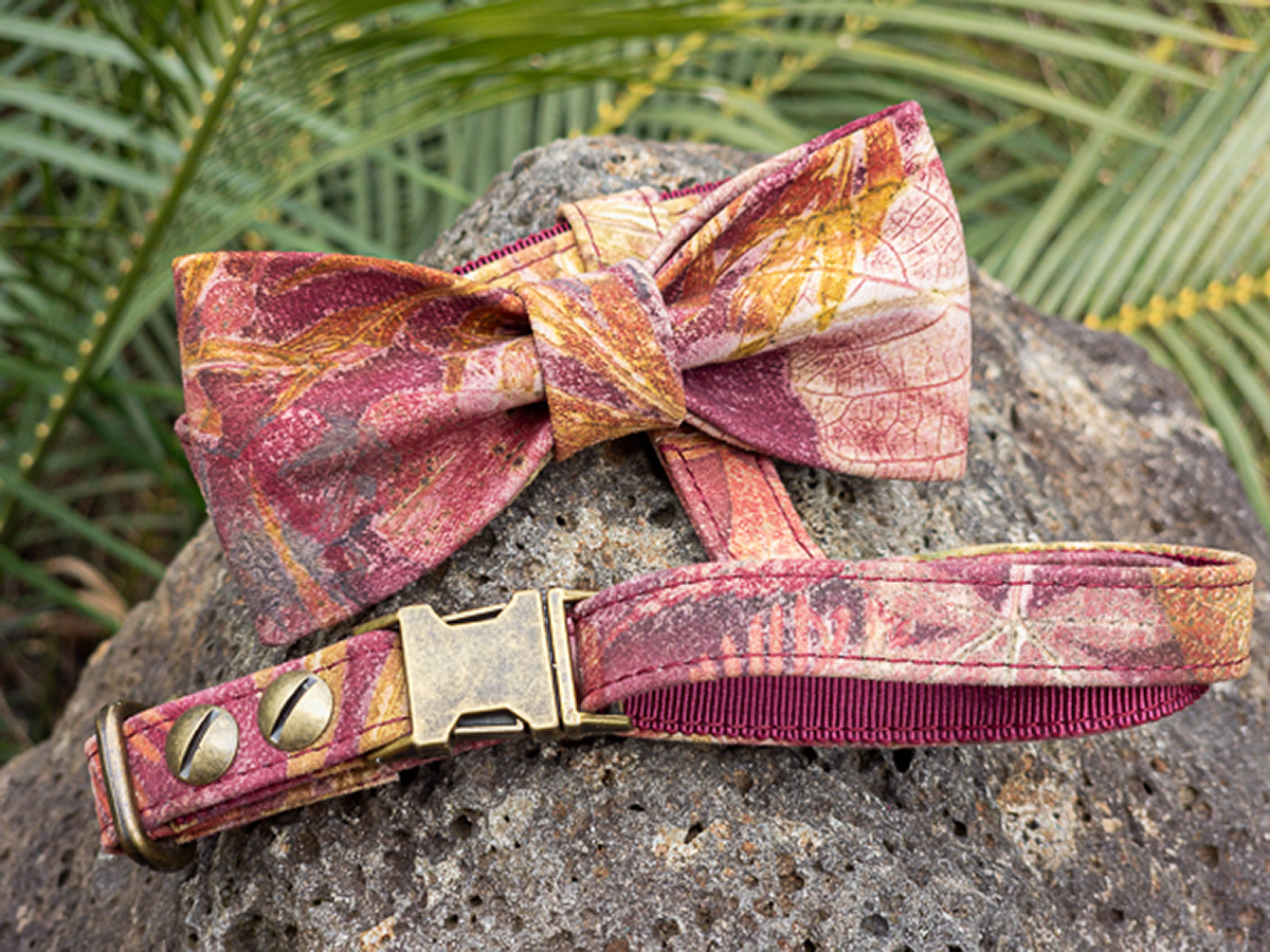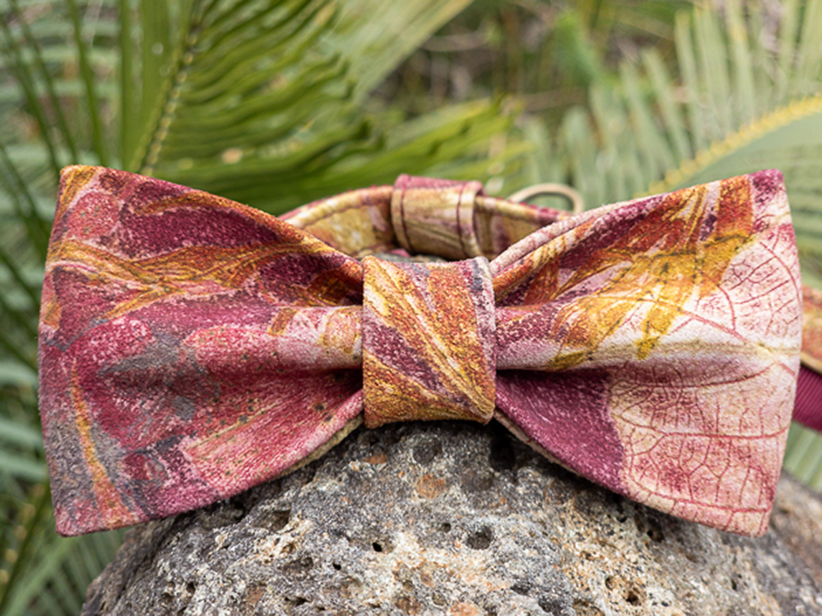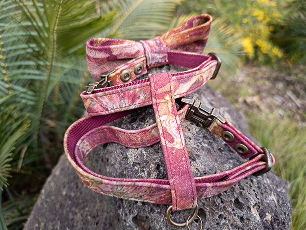 Each House Copernicus Bow Tie Harness is hand-crafted and stitched in small batches from sustainably sourced, eco-printed Australian kangaroo leather. Pressed and dried leaves and flowers are arranged on the hide, then bundled and steamed so their natural pigments and tannins transfer to the leather—creating permanent, plant-made prints (not painted on). The sculptural bow adds refined style without compromising fit or freedom of movement. No two harnesses are the same; this harness turns heads—expect attention!