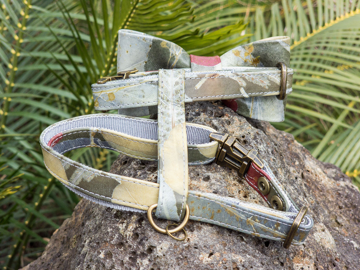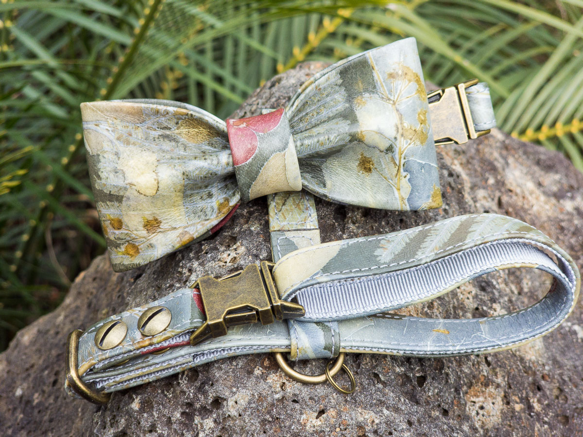 Handmade eco-printed kangaroo-leather cat harness with a sculptural bow tie.