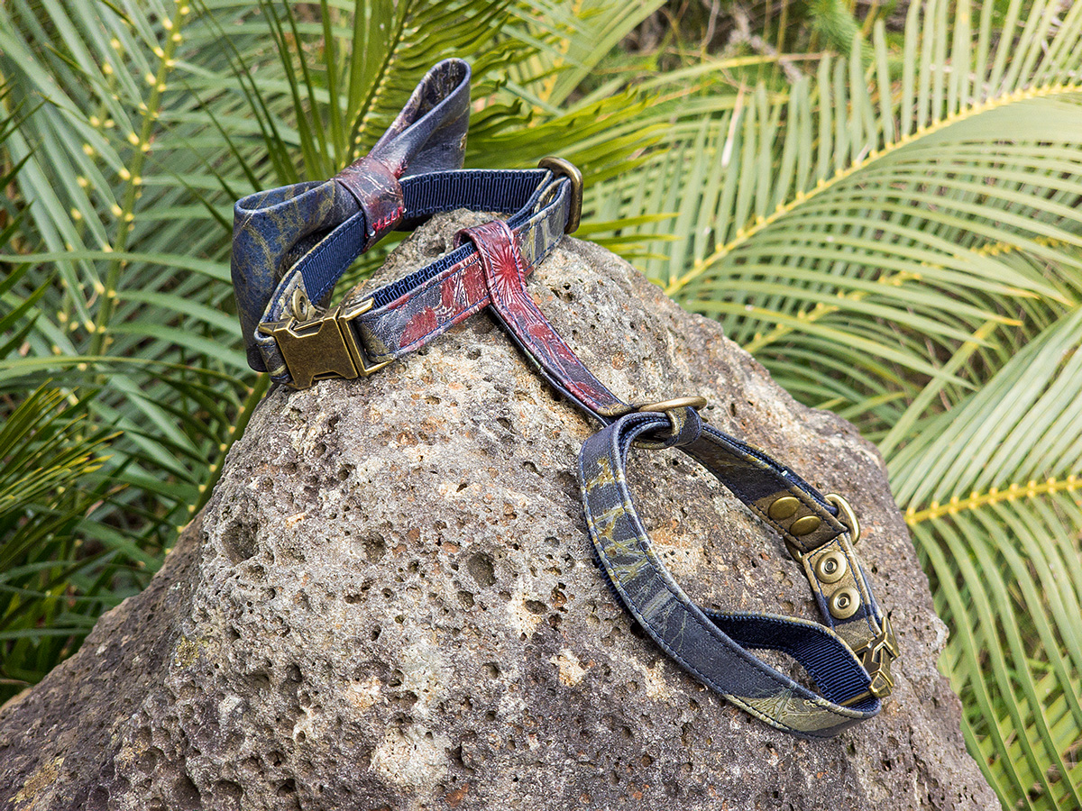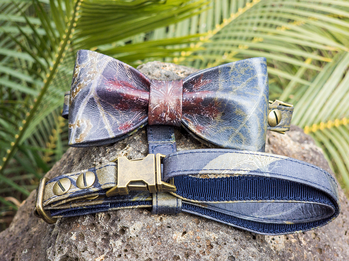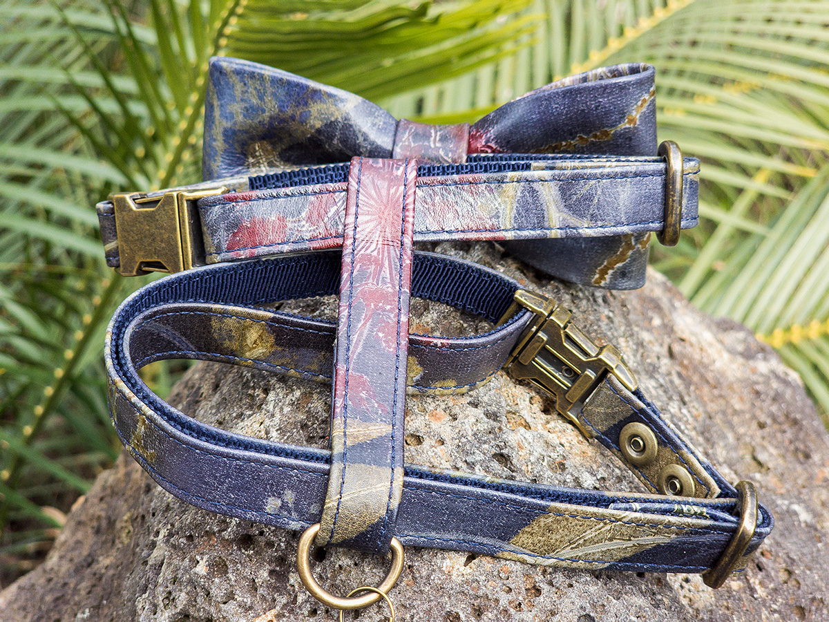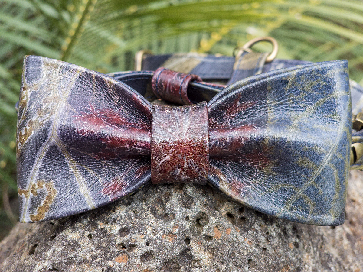 Each House Copernicus Bow Tie Harness is hand-crafted and stitched in small batches from sustainably sourced, eco-printed Australian kangaroo leather. Pressed and dried leaves and flowers are arranged on the hide, then bundled and steamed so their natural pigments and tannins transfer to the leather—creating permanent, plant-made prints (not painted on). The sculptural bow adds refined style without compromising fit or freedom of movement. No two harnesses are the same; this harness turns heads—expect attention!