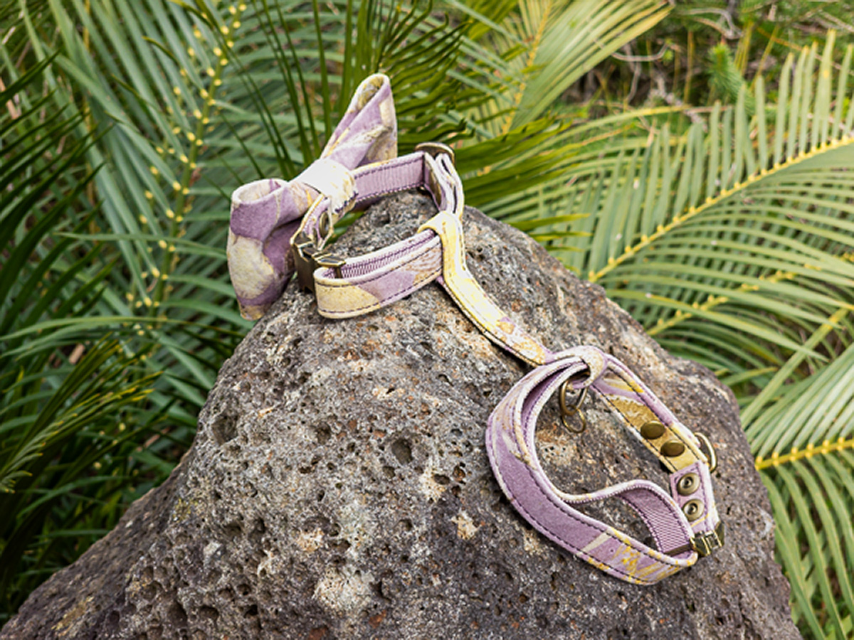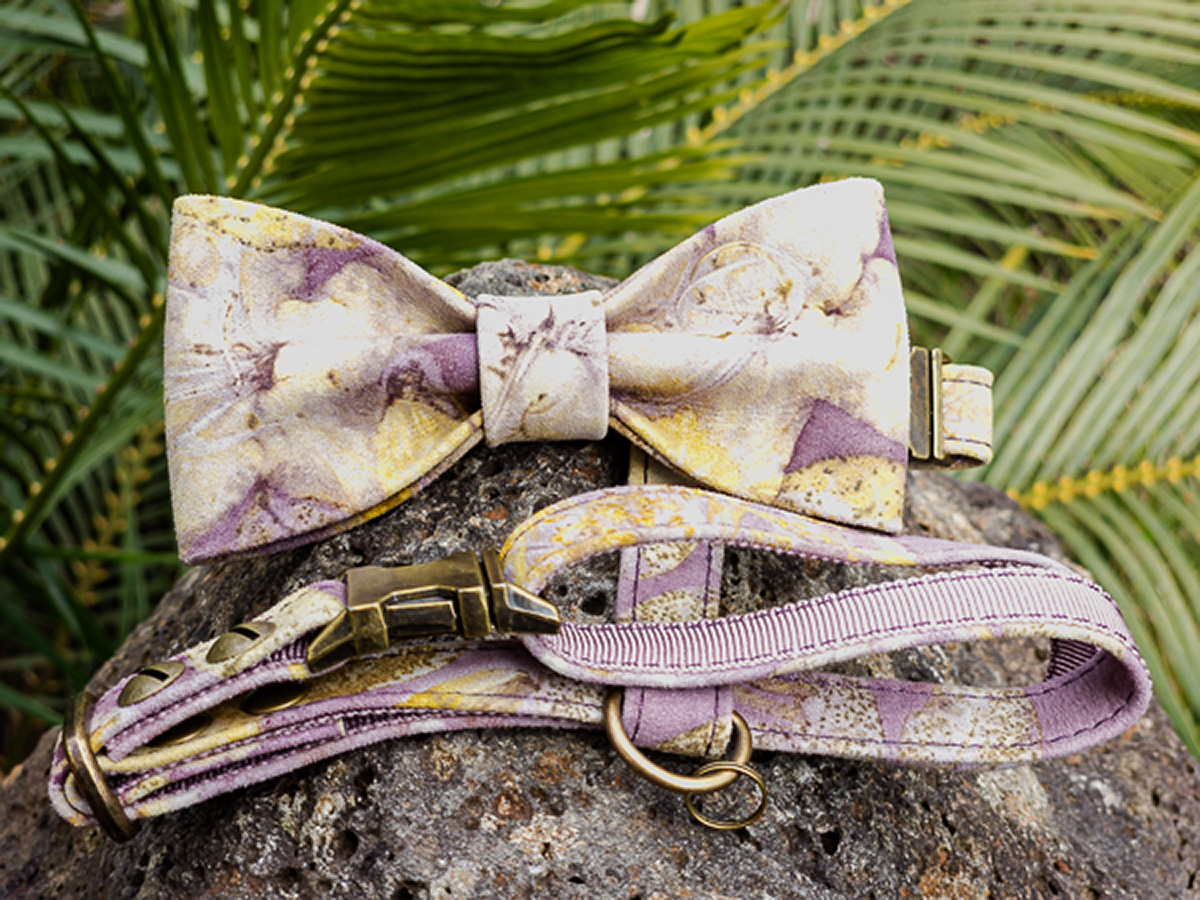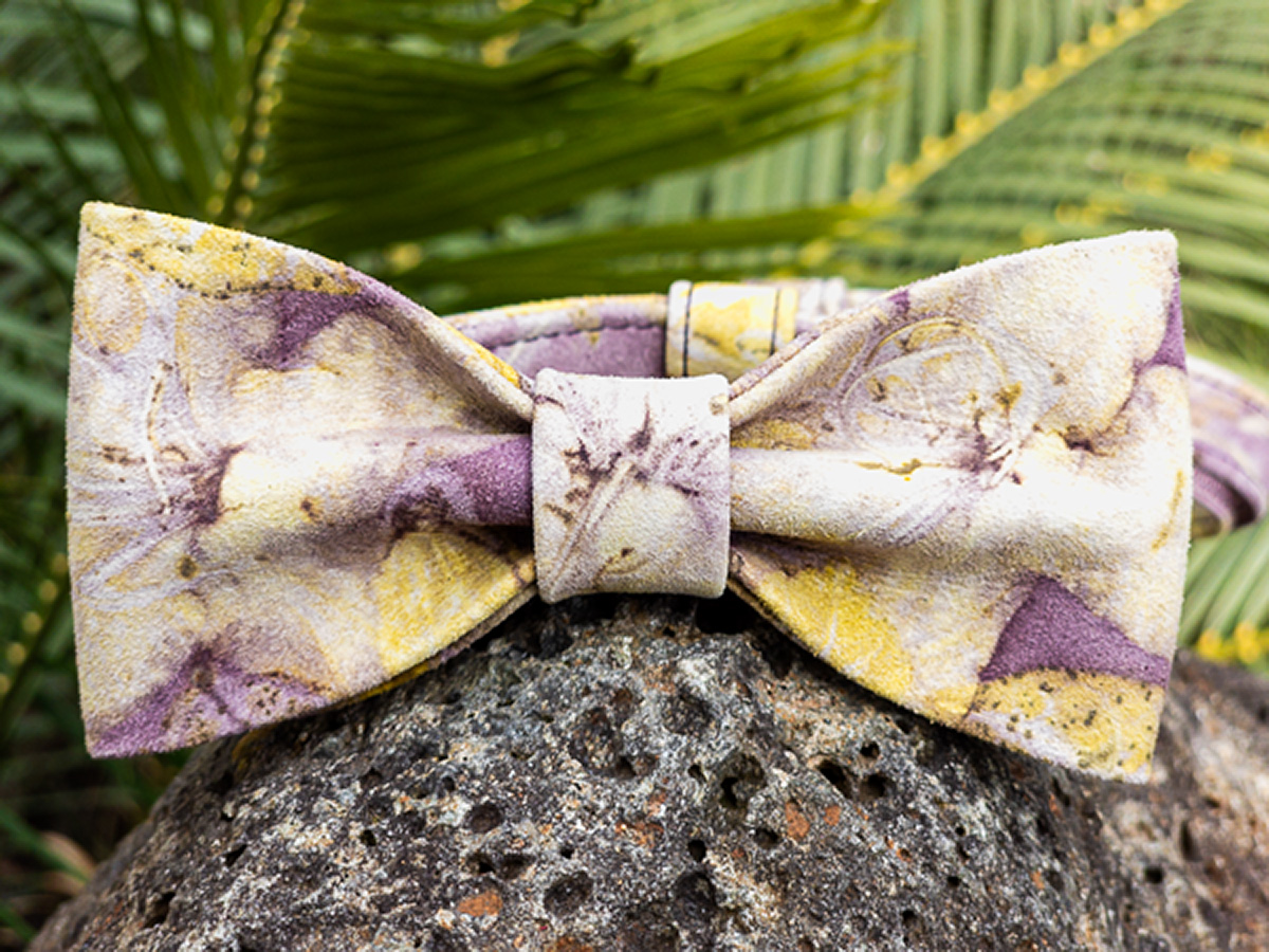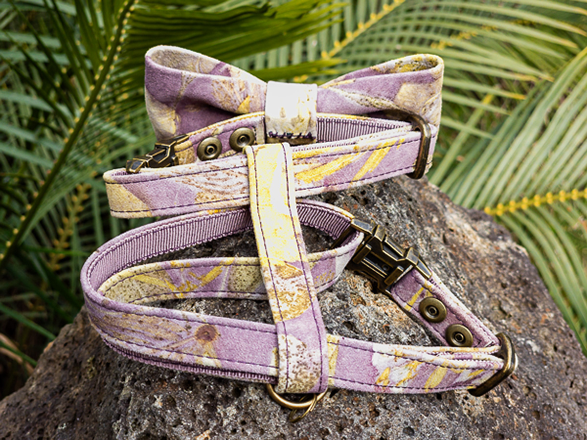 Each House Copernicus Bow Tie Harness is hand-crafted and stitched in small batches from sustainably sourced, eco-printed Australian kangaroo leather. Pressed and dried leaves and flowers are arranged on the hide, then bundled and steamed so their natural pigments and tannins transfer to the leather—creating permanent, plant-made prints (not painted on). The sculptural bow adds refined style without compromising fit or freedom of movement. No two harnesses are the same; this harness turns heads—expect attention!
