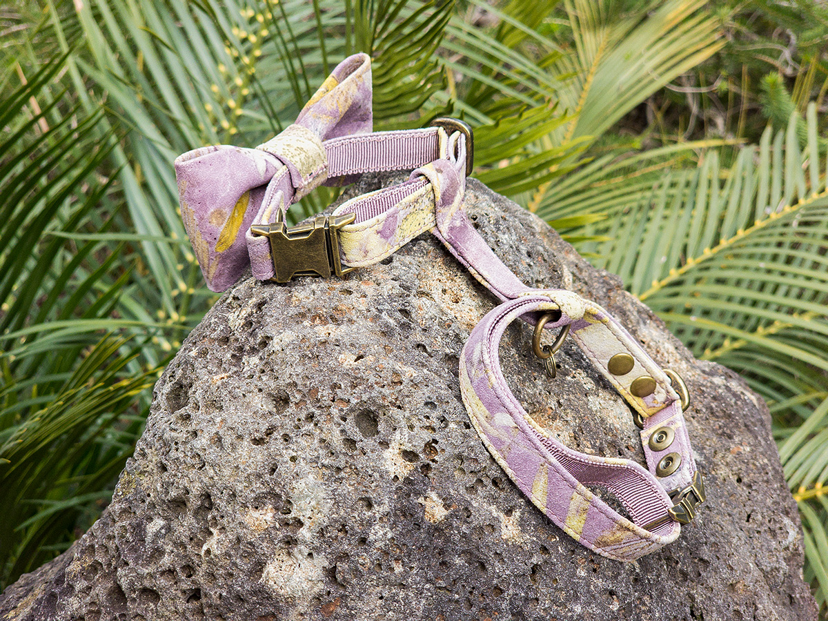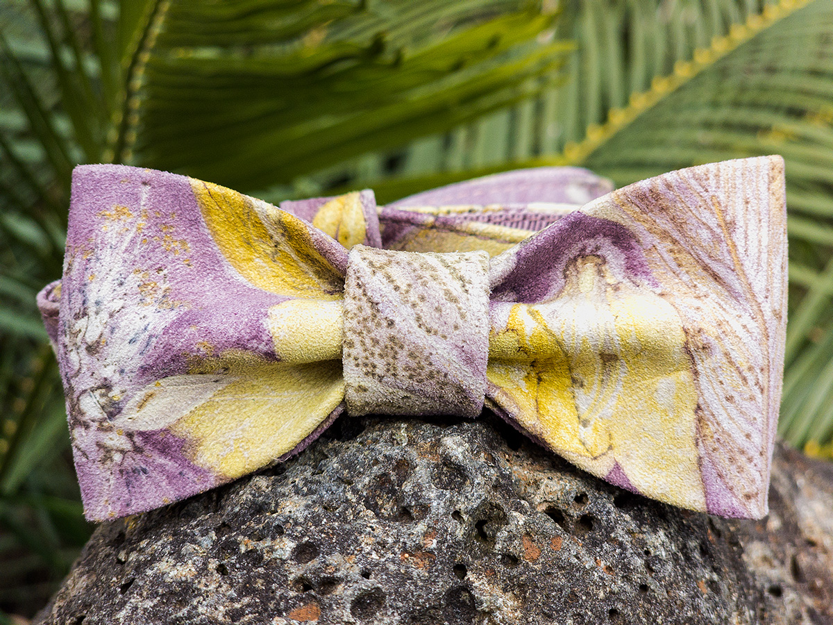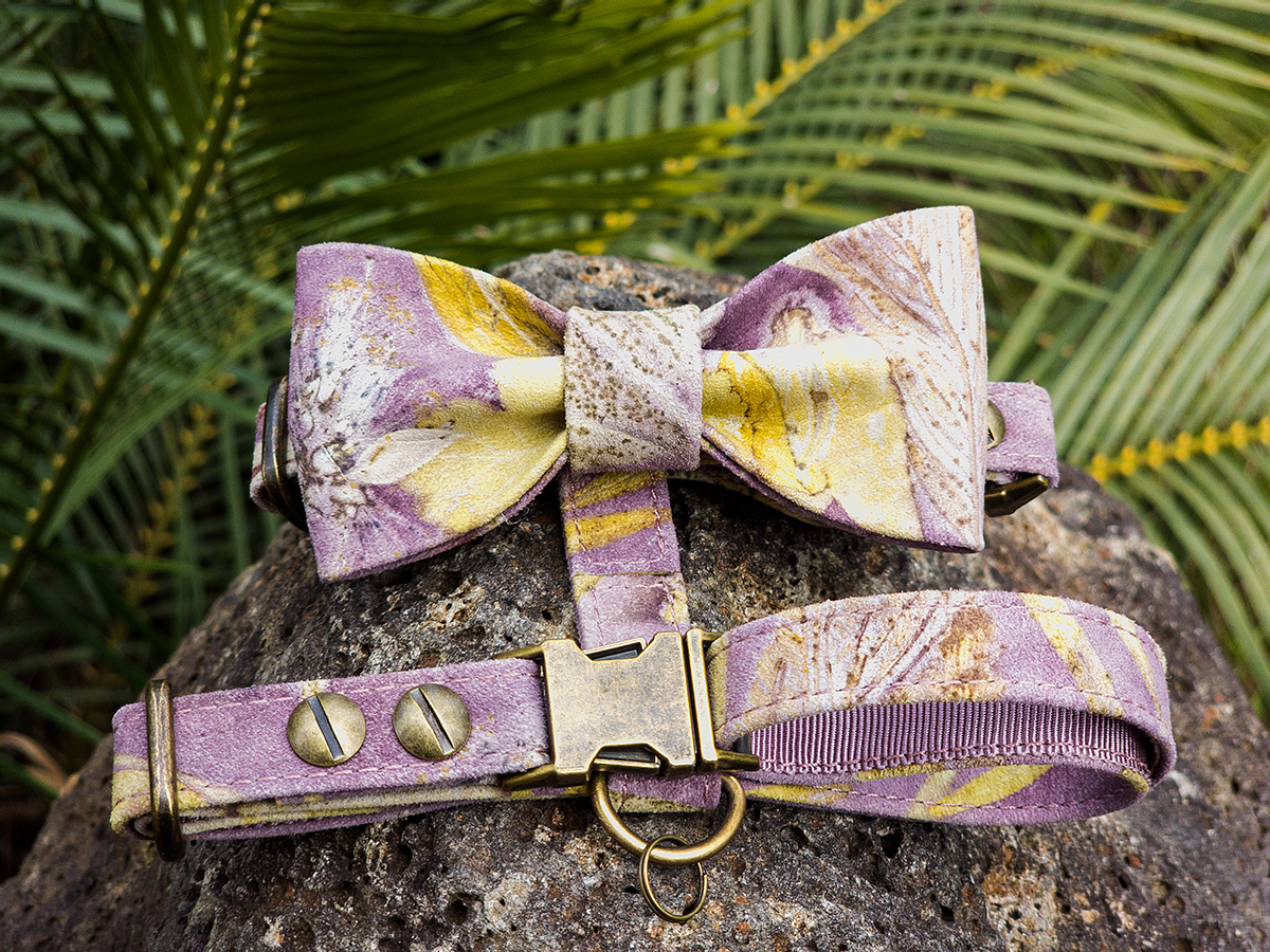Each House Copernicus Bow Tie Harness is hand-crafted and stitched in small batches from sustainably sourced, eco-printed Australian kangaroo leather. Pressed and dried leaves and flowers are arranged on the hide, then bundled and steamed so their natural pigments and tannins transfer to the leather—creating permanent, plant-made prints (not painted on). The sculptural bow adds refined style without compromising fit or freedom of movement. No two harnesses are the same; this harness turns heads—expect attention!
