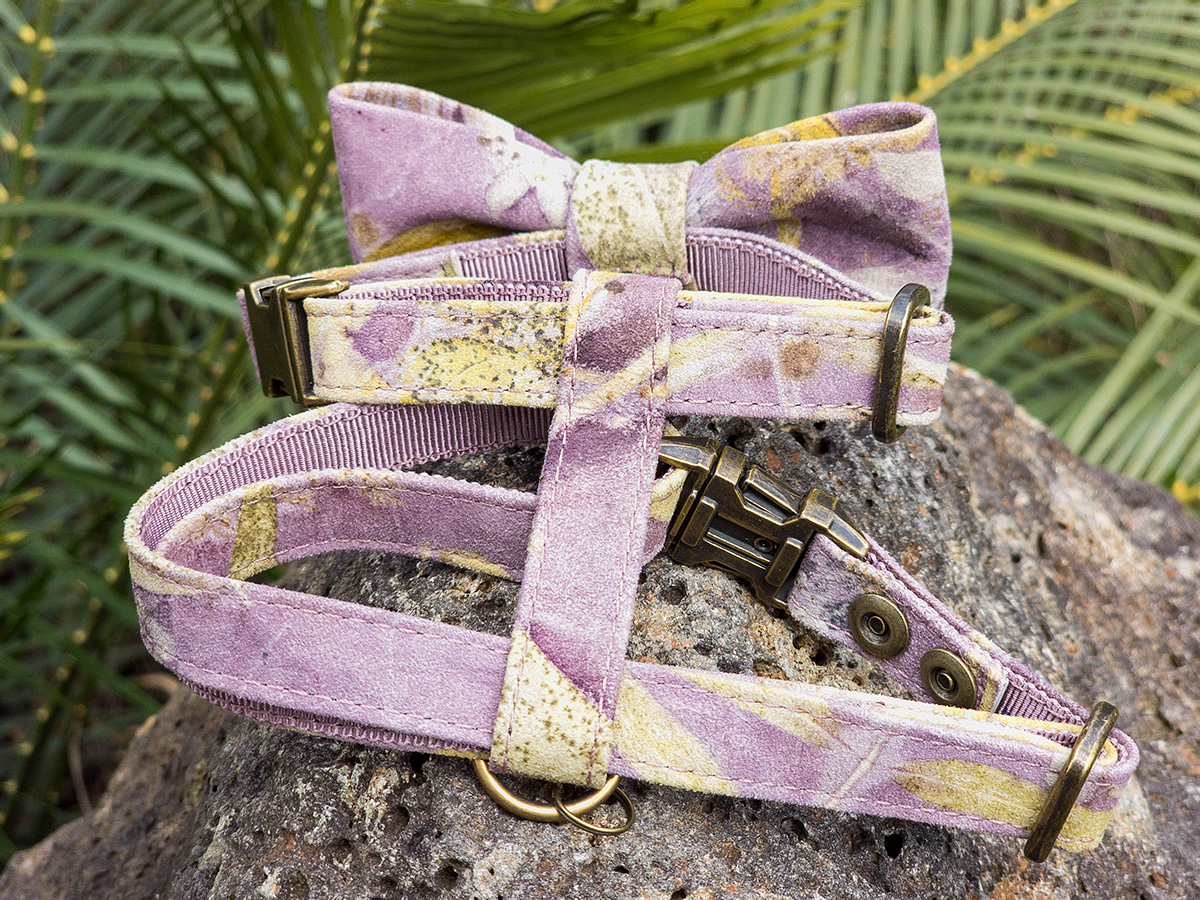 The Rhea A10 Harness has been eco-printed with Bottlebrush, Bossiaea, Wattle, Bootlace Bush, dyed with Lac and finished on Kangaroo Suede in Lilac.