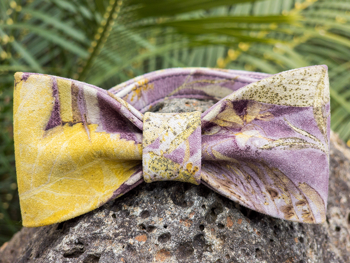 - Eco-printed kangaroo leather: Botanicals and plant-based dyes for naturally one-of-a-kind colour and pattern.