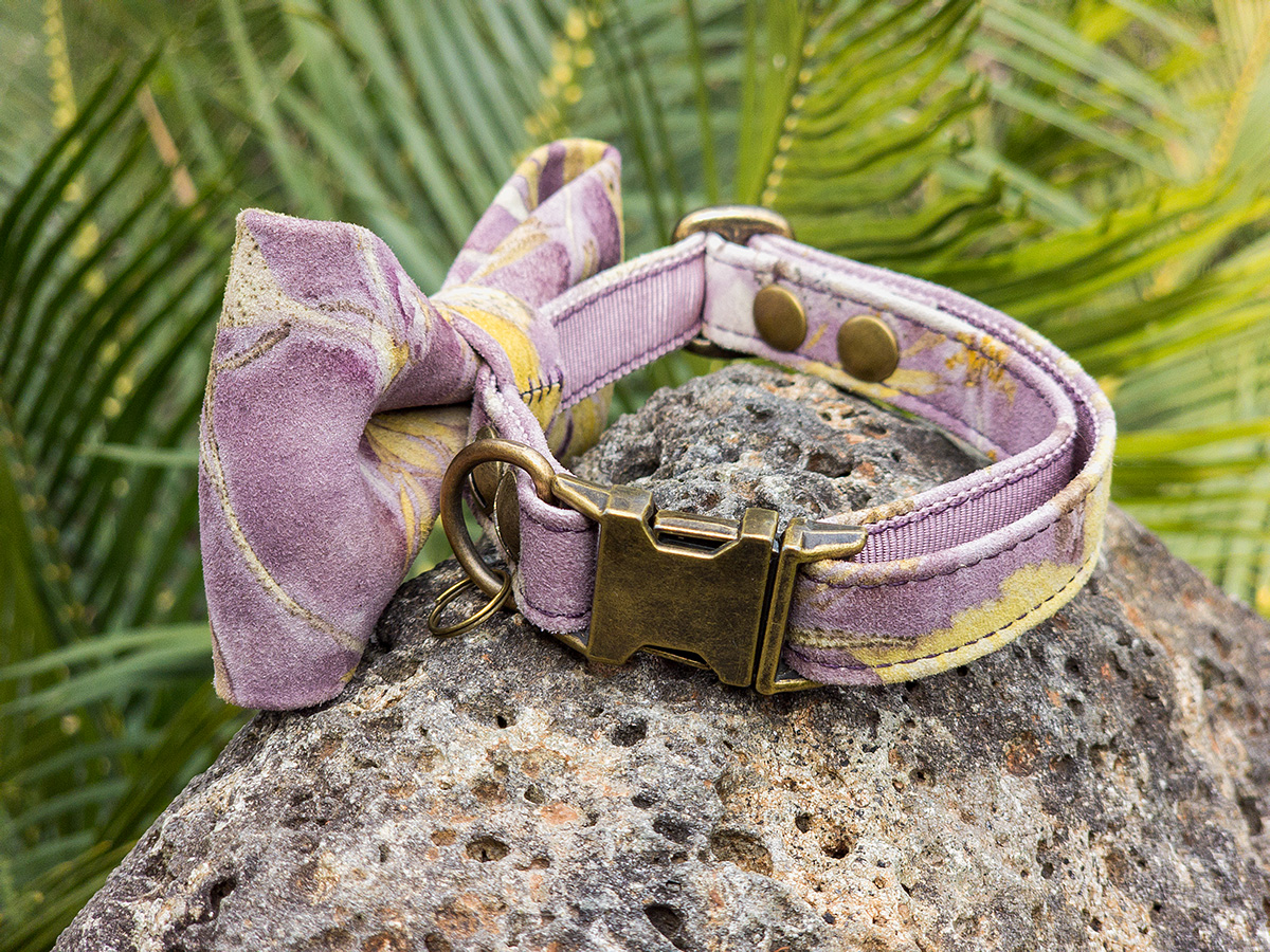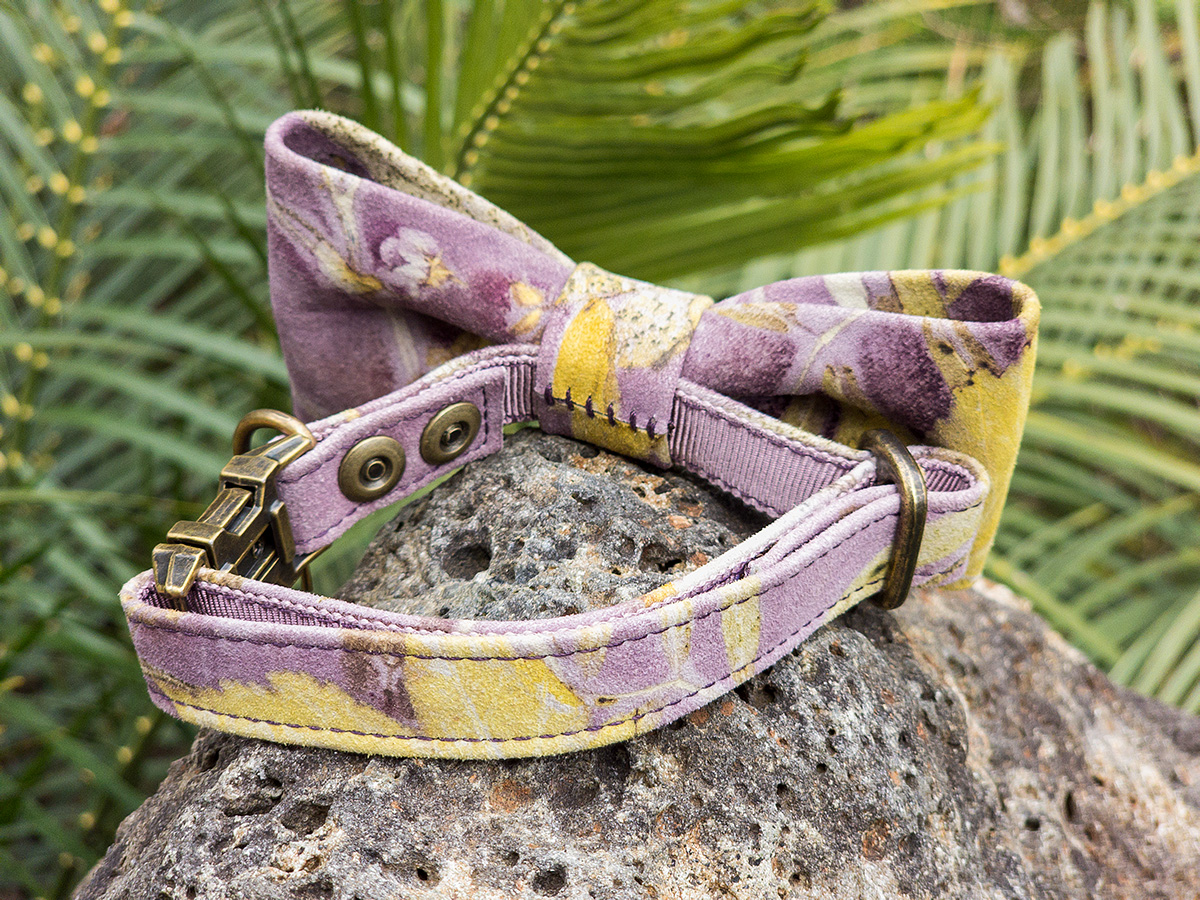 Each House Copernicus Bow Tie Collar is hand-crafted and stitched in small batches from sustainably sourced, eco-printed Australian kangaroo leather. Pressed and dried leaves and flowers are arranged on the hide, then bundled and steamed so their natural pigments and tannins transfer to the leather—creating permanent, plant-made prints (not painted on). The sculptural bow adds refined style without compromising fit or freedom of movement. No two collars are the same; this collar turns heads—expect attention!